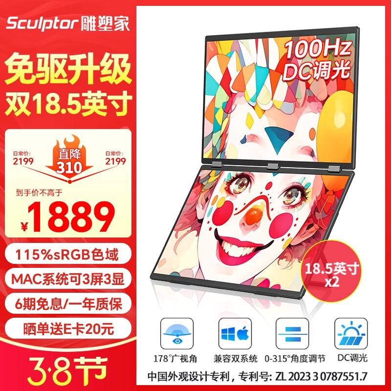 雕塑家sculptor 18.5英寸折叠双屏显示器促销