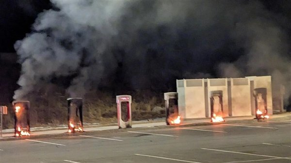 除此之外,美国马萨诸塞州也发生了类似事件,多个特斯拉超级充电桩被故意纵火焚烧,当地警方正在调查中。