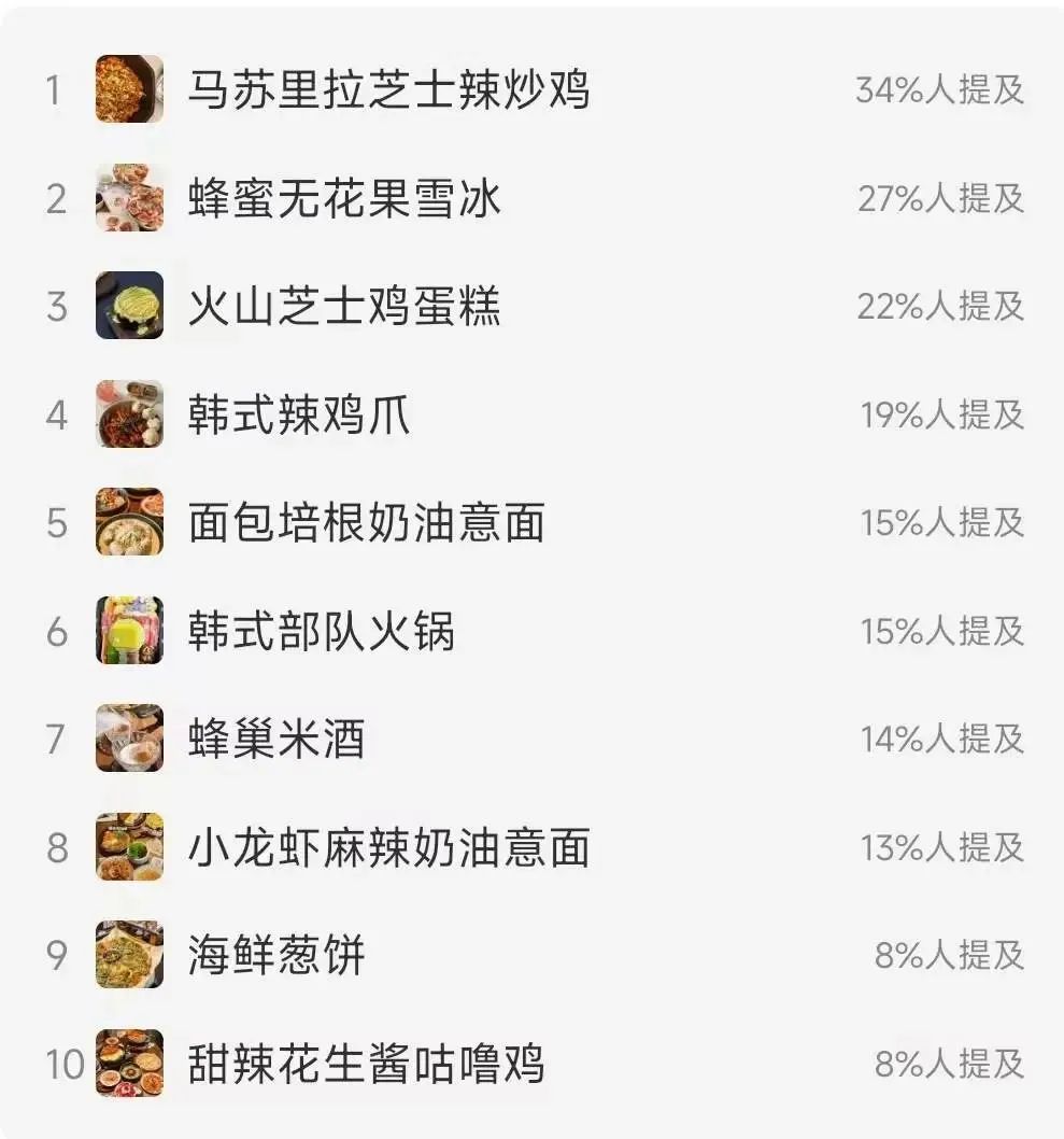 在小红书平台,马苏里拉芝士辣炒鸡、蜂蜜无花果雪冰、火山芝士蛋糕等创意菜品受到网友热捧。马苏里拉芝士辣炒鸡的热度最高,有34%网友在韩式创意料理的相关帖子中都提到了该菜品。