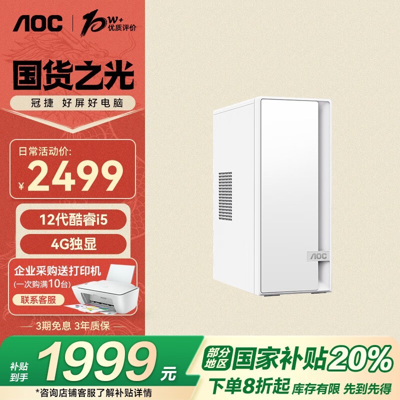 AOC台式电脑主机12代i5-12400F京东特惠1979元