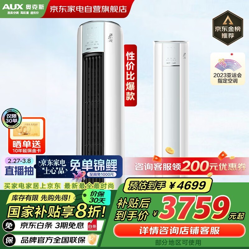 奥克斯3匹沐净风柜机空调京东促销价3665元