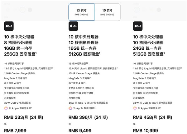 据悉,M4版MacBook Air提供13和15英寸两种尺寸,两款都是16GB内存起步,其中13英寸版本16+256G售价7999元,16+512G售价9499元,24G+512G售价10999元;15英寸版本16+256G售价9999元,16+512G售价11499元,24G+512G售价12999元。