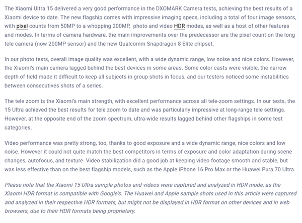 DXO表示,小米15 Ultra影像整体质量出色,具备目前市场上最强的变焦能力,是DXO测试中成绩最好的小米手机。