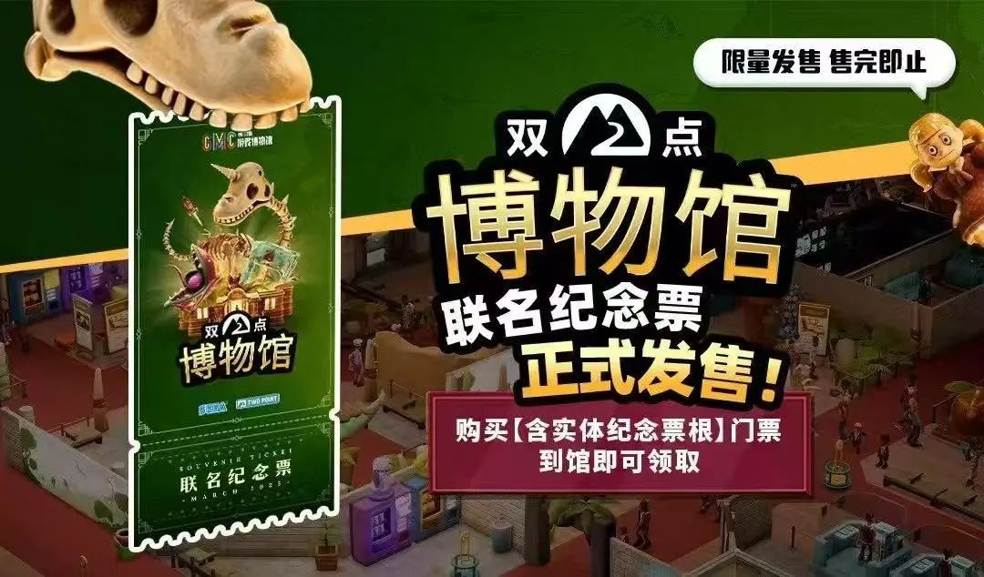 3月5日,《双点博物馆》游戏上线当天,中国音数协游戏博物馆和游戏官方联名,共同推出限量实体联名纪念票。3月5日至4月5日期间,即游戏发售首月,观众前往现场,购买博物馆门票即可获得该赠品(数量有限,送完即止)。