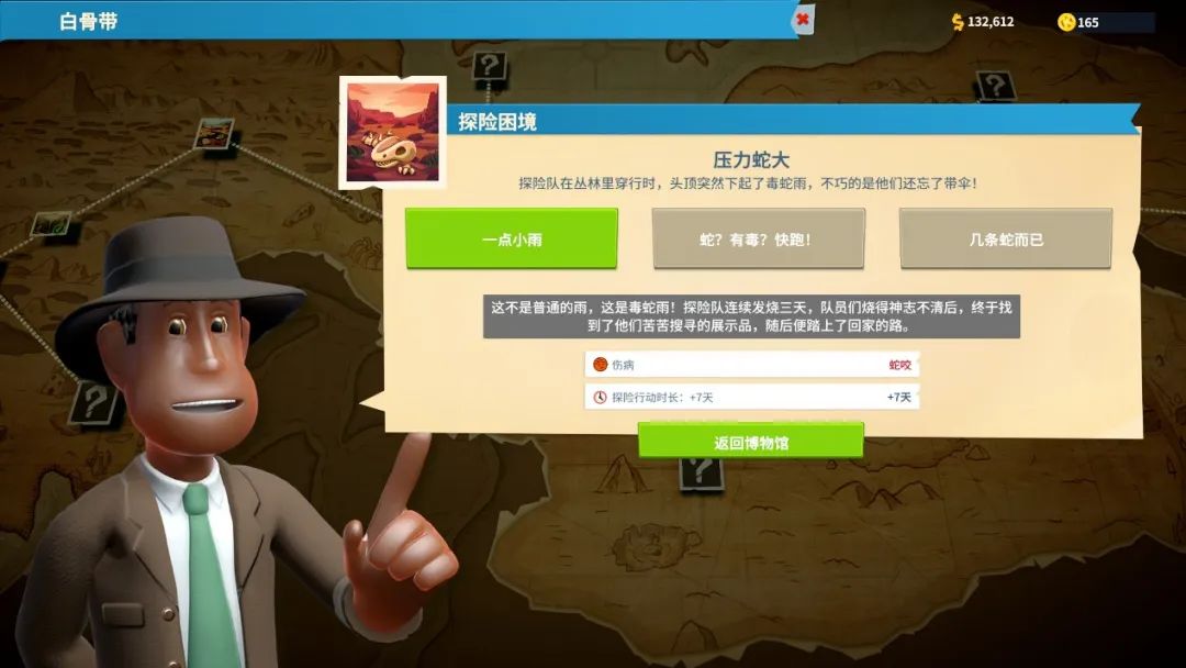 在探险过程中,每个员工都会使用到不同于室内工作的技能属性,还会时不时打电话给馆长求援——有些意外情况,需要玩家指示员工们做出重要的抉择和判断。这些判断会带来不同的结果,轻则大家多在出差的时候摸了一个星期鱼,重则伤痕累累回到博物馆“住院”(真应该跟《双点医院》联动一下)。