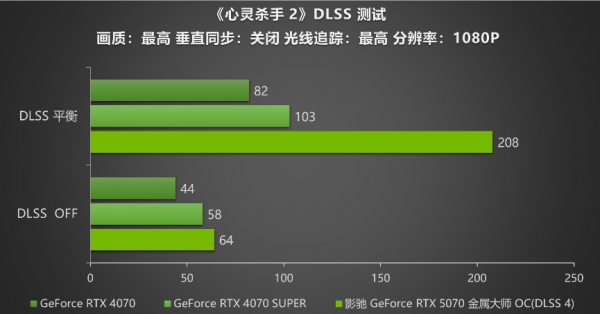 在《心灵杀手2》这款采用重度光线追踪的次世代游戏,光追效果对传统光栅化性能的压榨极为明显。在1080P分辨率下,影驰 GeForce RTX 5070 金属大师 OC 凭借自身性能可实现64帧流畅运行的成绩,而在开启DLSS 4技术后,帧数更是达到超过200帧的高分。