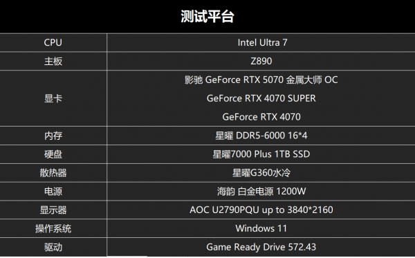 针对本次游戏测试,将选取GeForce RTX 4070、GeForce RTX 4070 SUPER以及影驰 GeForce RTX 5070 金属大师 OC进行。游戏方面选择已支持NVIDIA DLSS 4技术的《赛博朋克 2077》、《漫威争锋》与《心灵杀手 2》三款不同类型的游戏大作。进行NVIDIA DLSS技术开启前后的帧数对比——GeForce RTX 4070和GeForce RTX 4070 SUPER将开启DLSS 3模式,影驰 GeForce RTX 5070 金属大师 OC 将开启DLSS 4多帧生成技术。游戏将选取1080P/2K/4K三个分辨率下分别进行,游戏图像设置均设置最高画质,开启光线追踪技术,以实现最大限度释放显卡的全部算力潜力,反映其在面对高规格游戏时的真实表现。