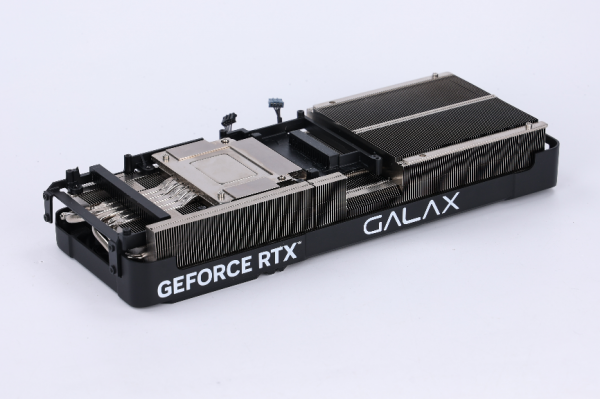 显卡上盖采用铝合金一体压铸成型工艺,整体为全覆盖式的金属盔甲。这一设计不仅赋予显卡极佳的质感和坚固度,还兼具了辅助散热的作用。背板同样为全金属加固设计,防止PCB因显卡自重而弯曲变形,并保护背面的元件不受外力损伤。本次测试采用的影驰 GeForce RTX 5070 金属大师 OC,采用了简约的撞色设计组成,辅以银色边缘点缀和CNC切割的亮面倒角,使显卡既保留了金属大师系列标志性的质感,又在细节处彰显更为精致的感觉。这种设计语言低调而不失高级,相信能迎合很多玩家对美学和个性的追求。