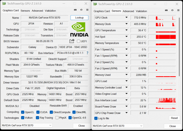 根据GPU-Z,可看到影驰 GeForce RTX 5070 金属大师 OC具体的参数表现和实际规格。在待机状态下,该卡温度为38.4℃,功耗仅为5.6W。