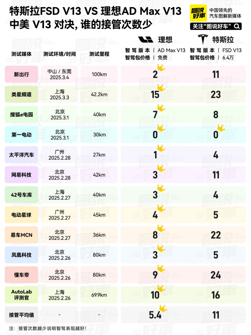 理想汽车CEO李想表示今日发文表示,自2月25日特斯拉FSD入华以来,多家汽车专业媒体在北京、上海、广州等全国各城市对理想AD Max V13与特斯拉FSD V13进行了智驾对比测试。根据各家的测试结果,理想AD Max的接管次数明显更少。