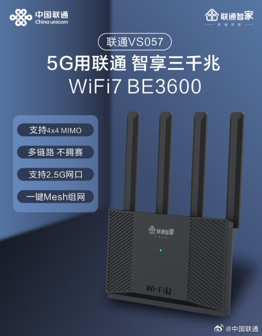 据了解,VS057是中国联通首款纯国产化Wi-Fi 7智能路由器,融入AI技术和云存储技术,在保障用户无线网络使用的同时还带来了全新智能体验。