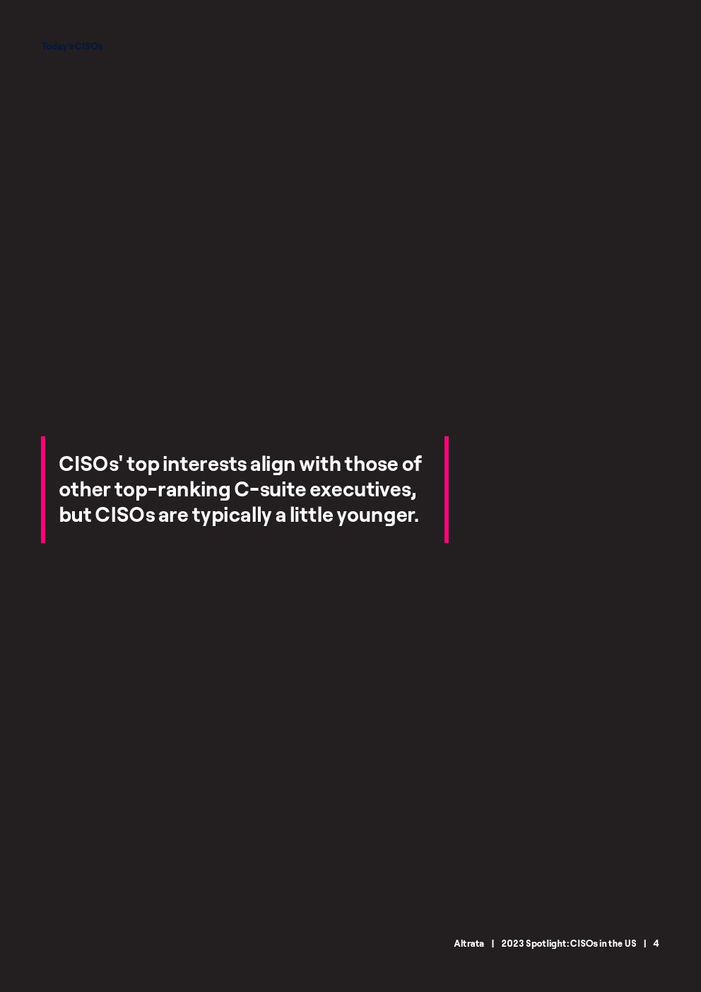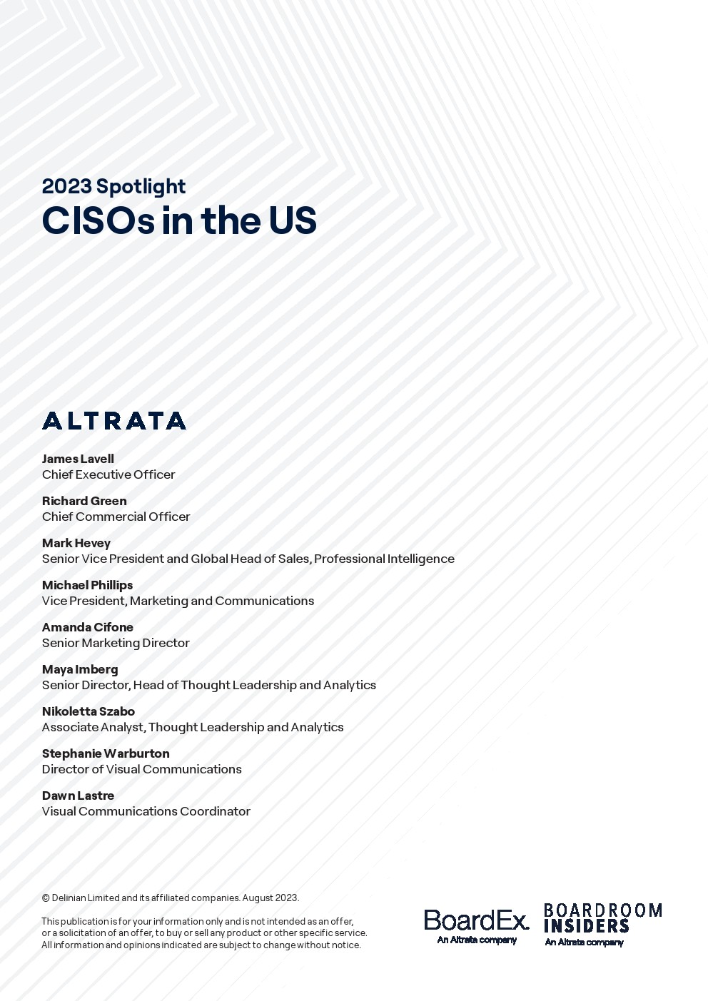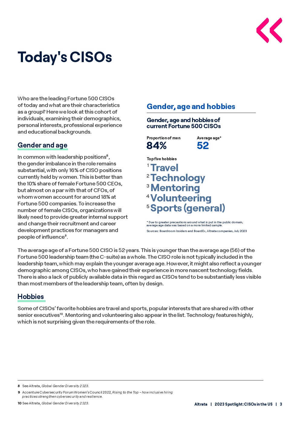 旅行和运动是首席信息安全官们最喜欢的消遣和兴趣。这些与其他顶级高管的爱好一致,而指导和志愿活动也在列表中。与其他高管一样,首席信息安全官也存在严重的性别失衡,只有16%的首席信息安全官职位由女性担任。一般来说,首席信息安全官的年龄在52岁左右,比高管层的领导者要年轻一些,这在一定程度上可能是由于该职位的具体技术要求。