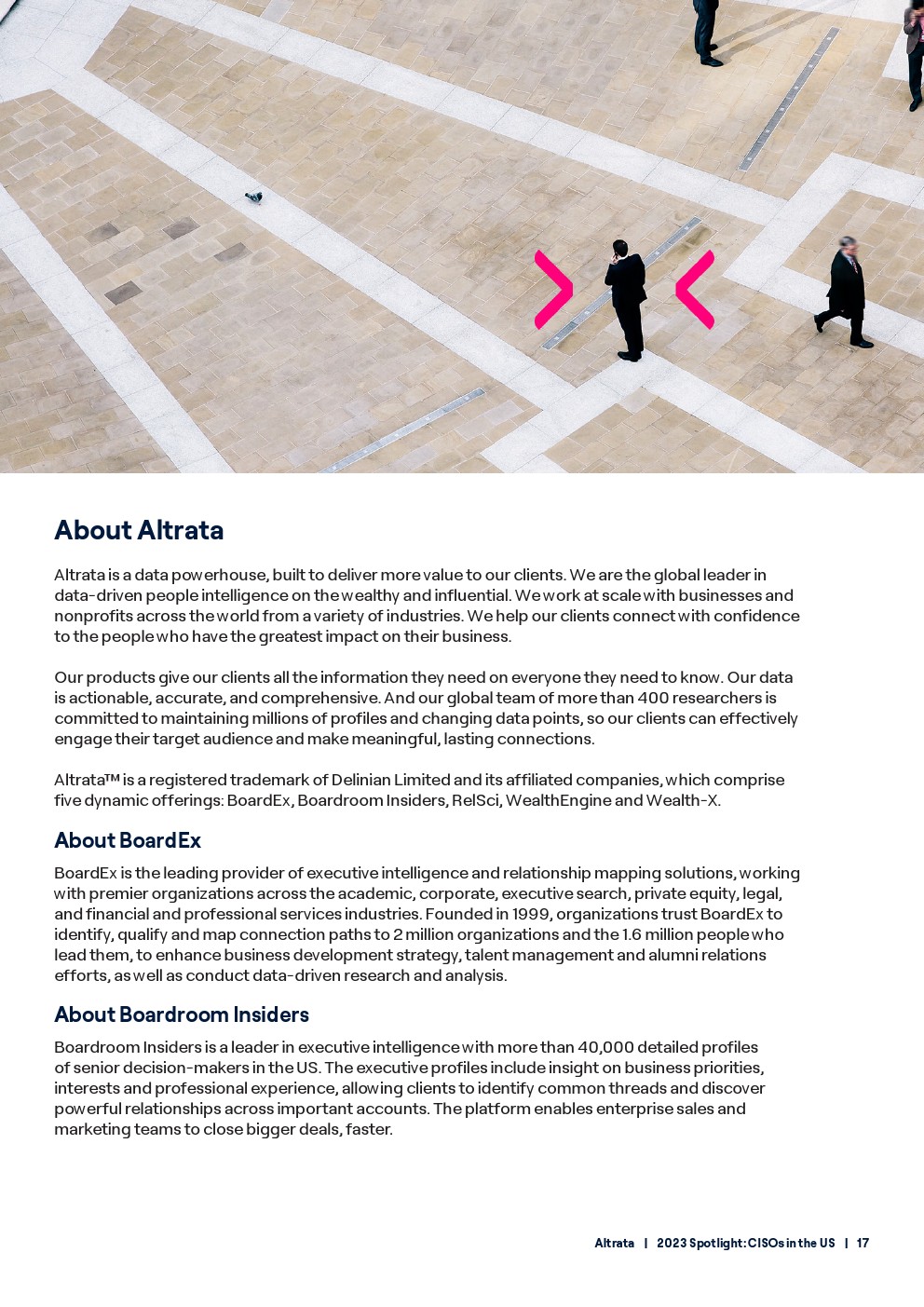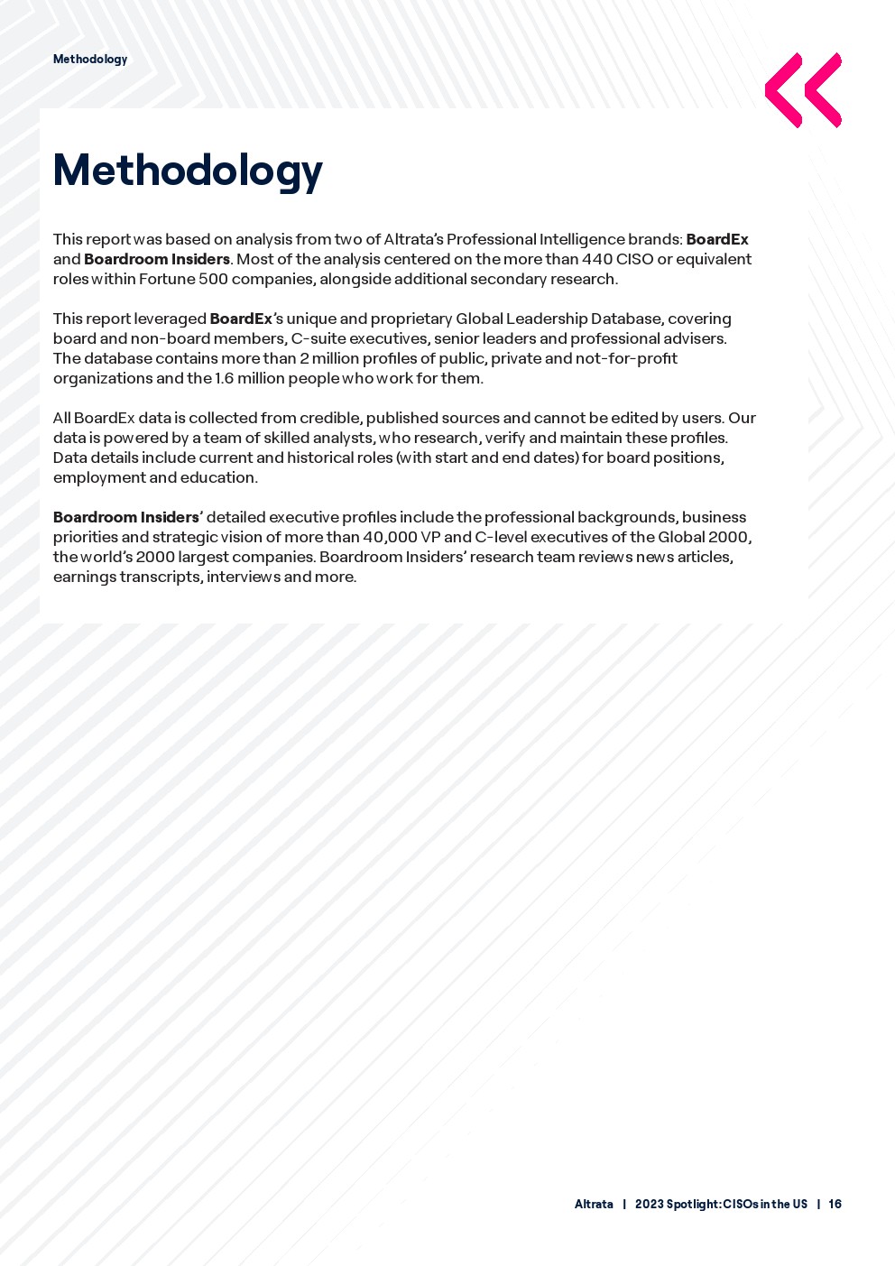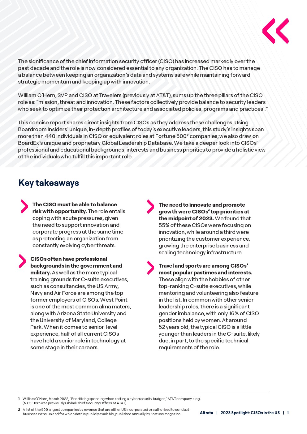 旅行和运动是首席信息安全官们最喜欢的消遣和兴趣。这些与其他顶级高管的爱好一致,而指导和志愿活动也在列表中。与其他高管一样,首席信息安全官也存在严重的性别失衡,只有16%的首席信息安全官职位由女性担任。一般来说,首席信息安全官的年龄在52岁左右,比高管层的领导者要年轻一些,这在一定程度上可能是由于该职位的具体技术要求。