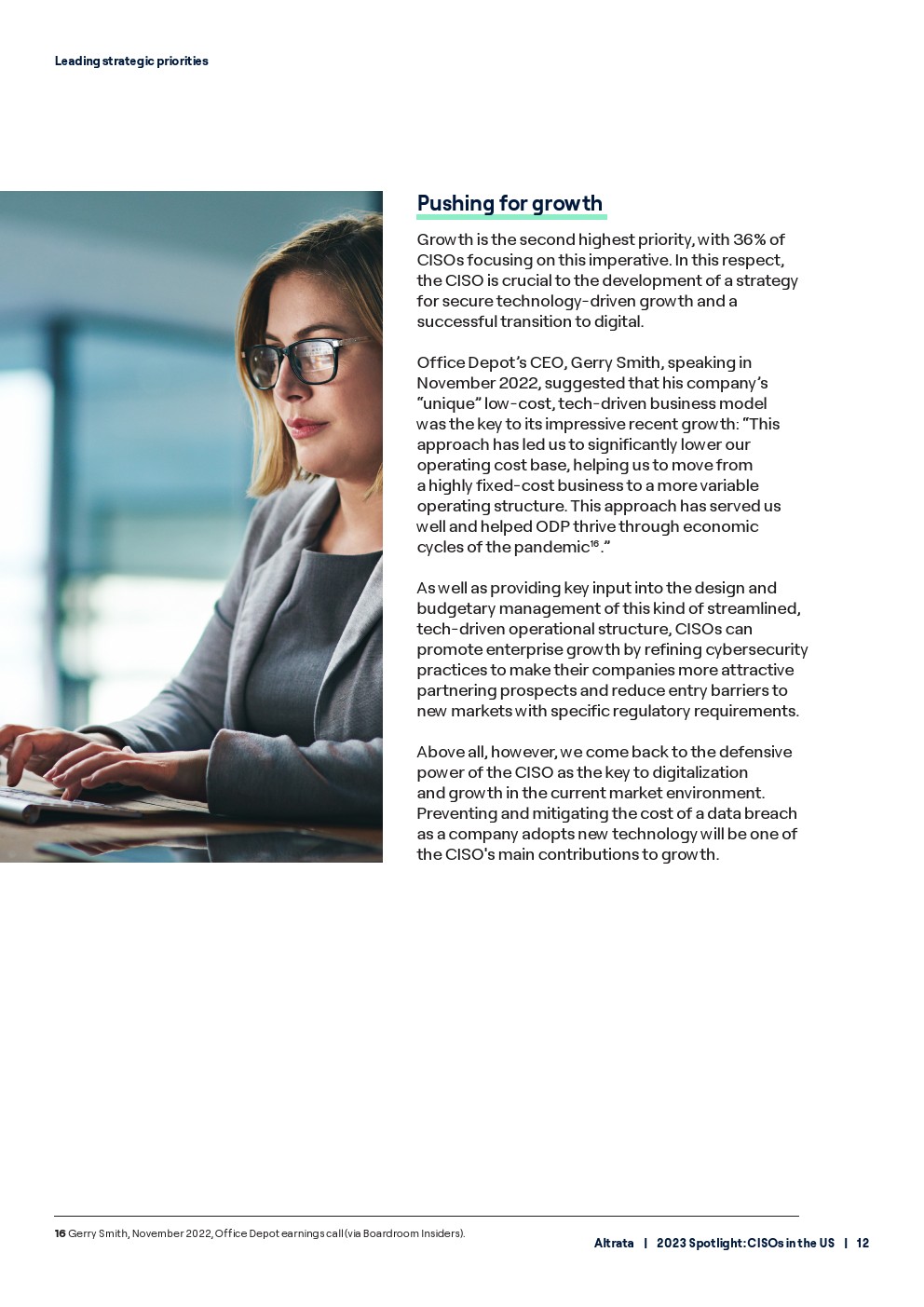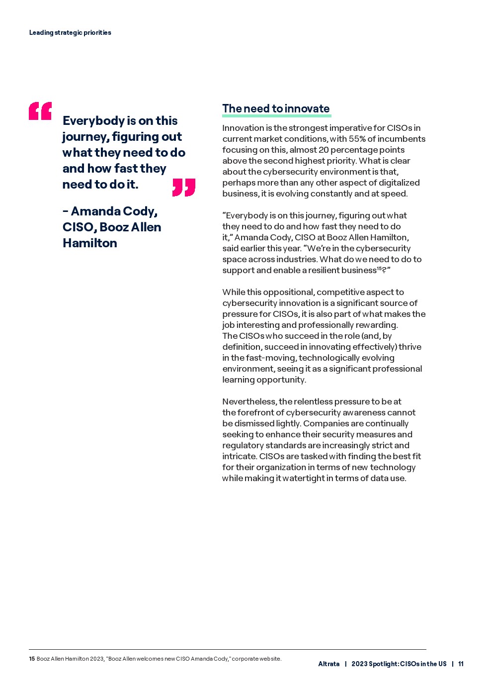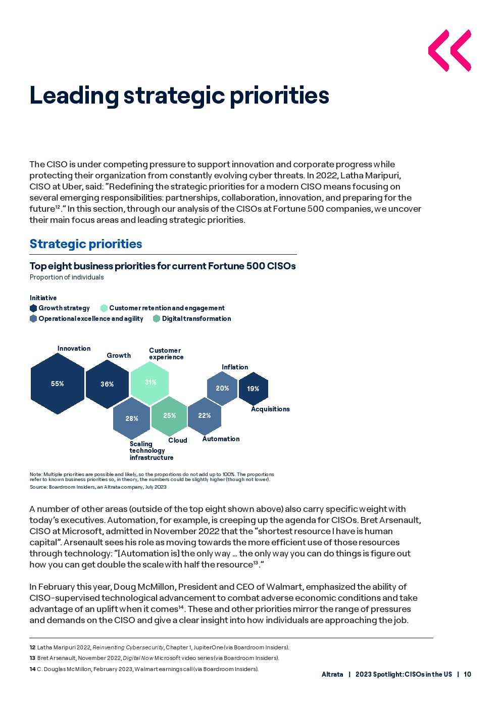在2023年中期,创新和促进增长的需求是首席信息安全官的首要任务。调查发现,55%的首席信息安全官专注于创新;约1/3的首席信息安全官优先考虑客户体验、发展业务和扩展技术基础设施。