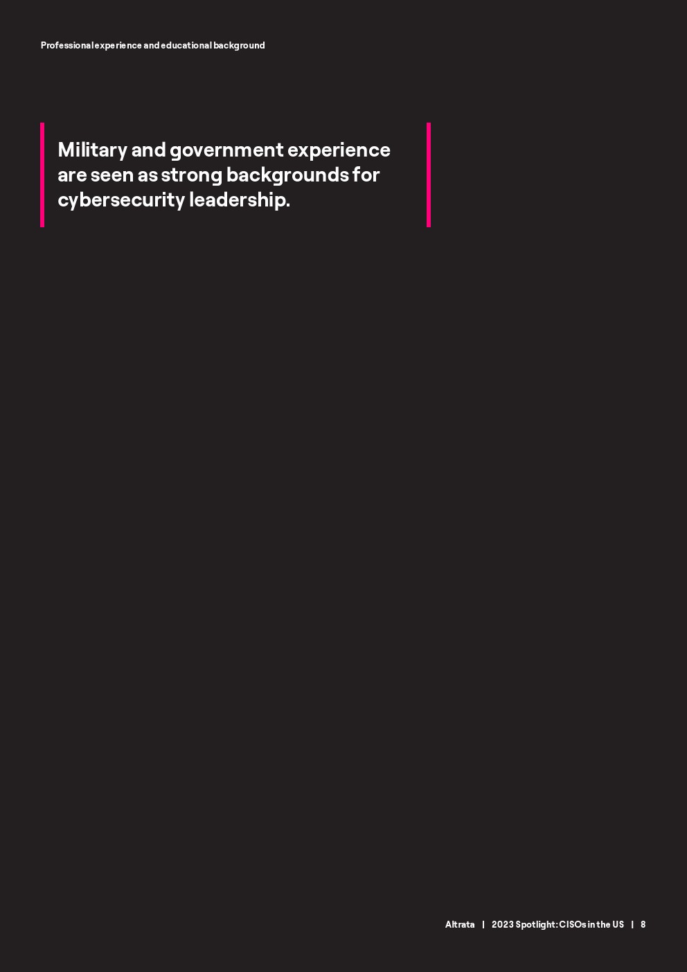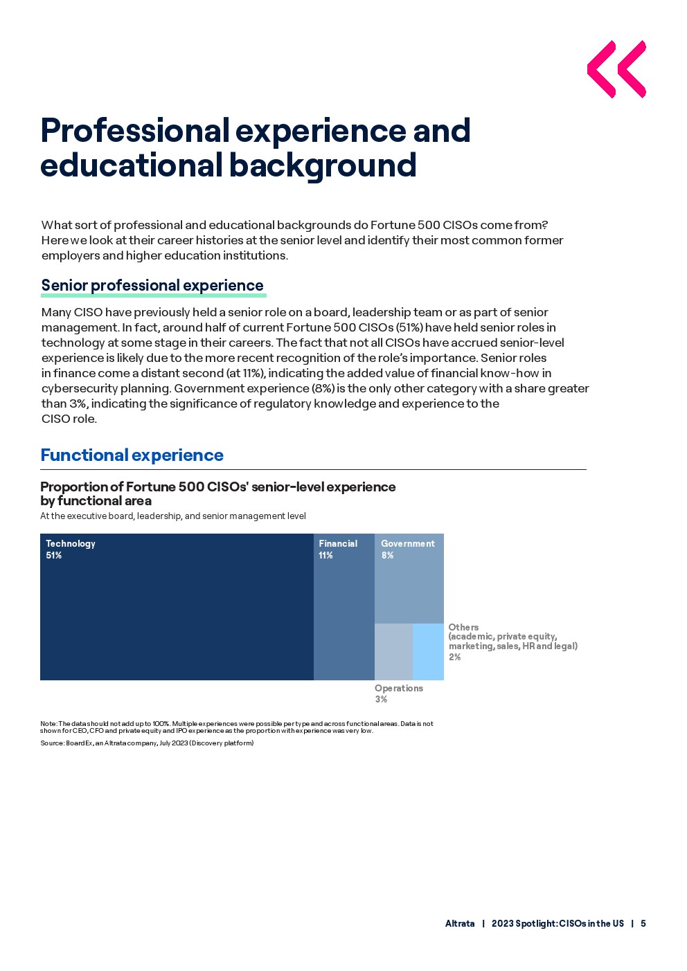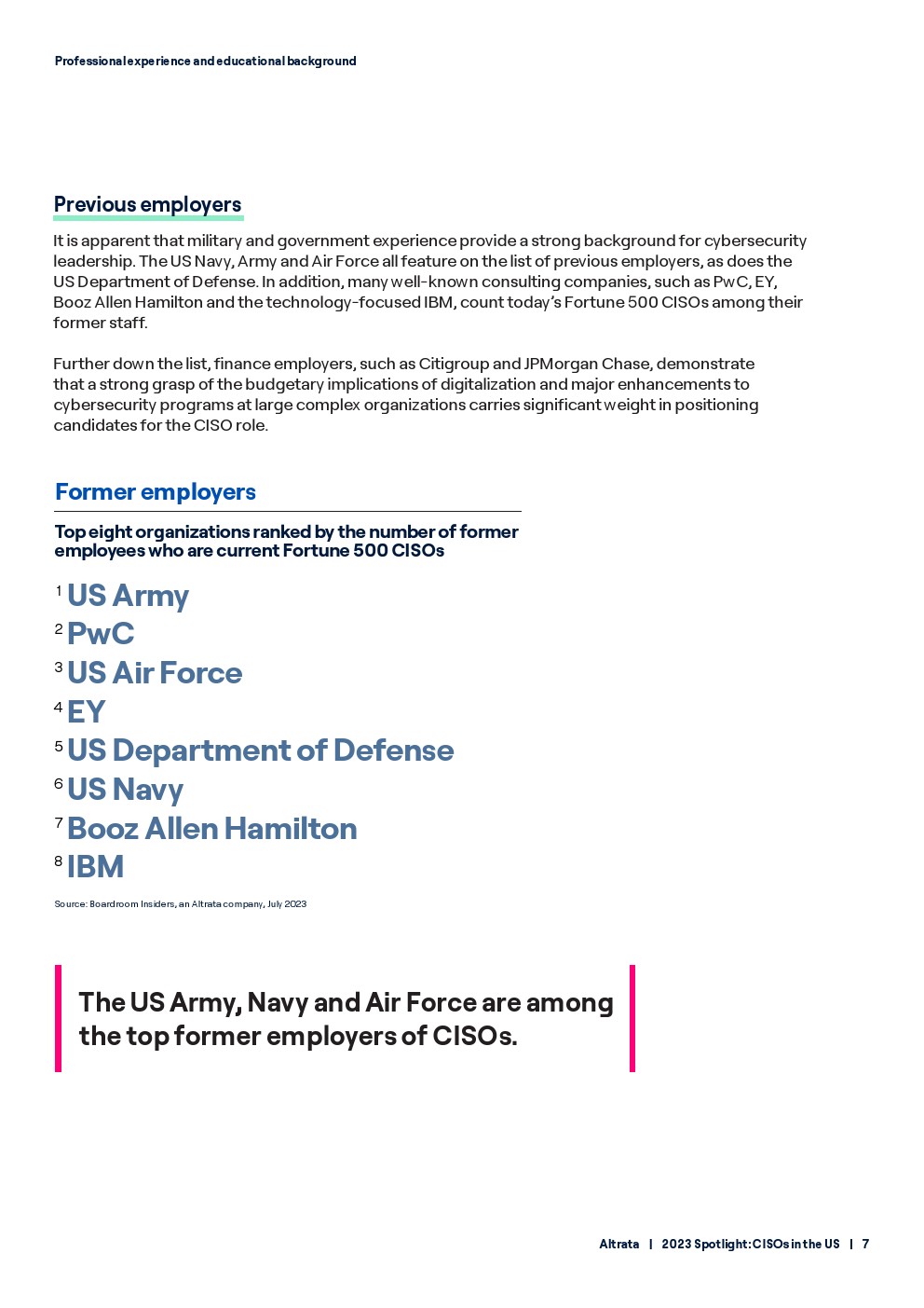 首席信息安全官通常有政府和军队的专业背景。除了咨询公司等更典型的C级高管培训场所外,美国陆军、海军和空军都是首席信息安全官的前雇主。当谈到高级经验时,所有现任首席信息安全官中有一半在其职业生涯的某个阶段担任过技术领域的高级职位。