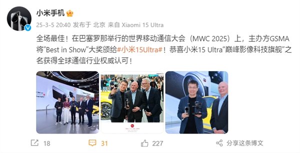快科技3月6日消息,在巴塞罗那举行的世界移动通信大会,小米15 Ultra拿下了MWC 2025"Best in Show"大奖,获得了全球通信行业的认可。