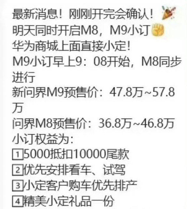 3月5日晚,一张有关问界M8和新问界M9预售价的图片在网上流传。图片显示,问界M8的预售价为36.8万至46.8万,新问界M9的预售价为47.8万至57.8万。小订将于3月6日9:08开始。
