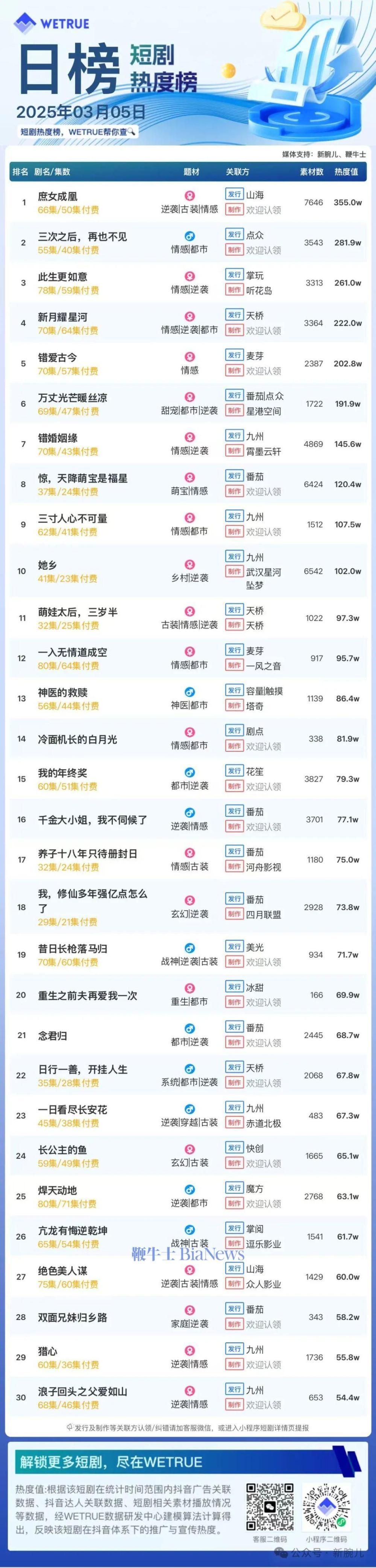 1、本日榜为WETRUE短剧数据公司提供,新腕儿和鞭牛士提供联合支持。