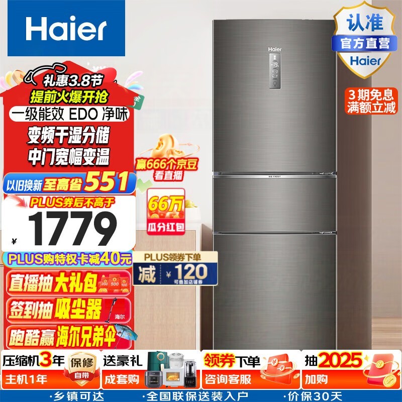 海尔253L风冷三门冰箱变频静音干燥保鲜双变频京东特惠
