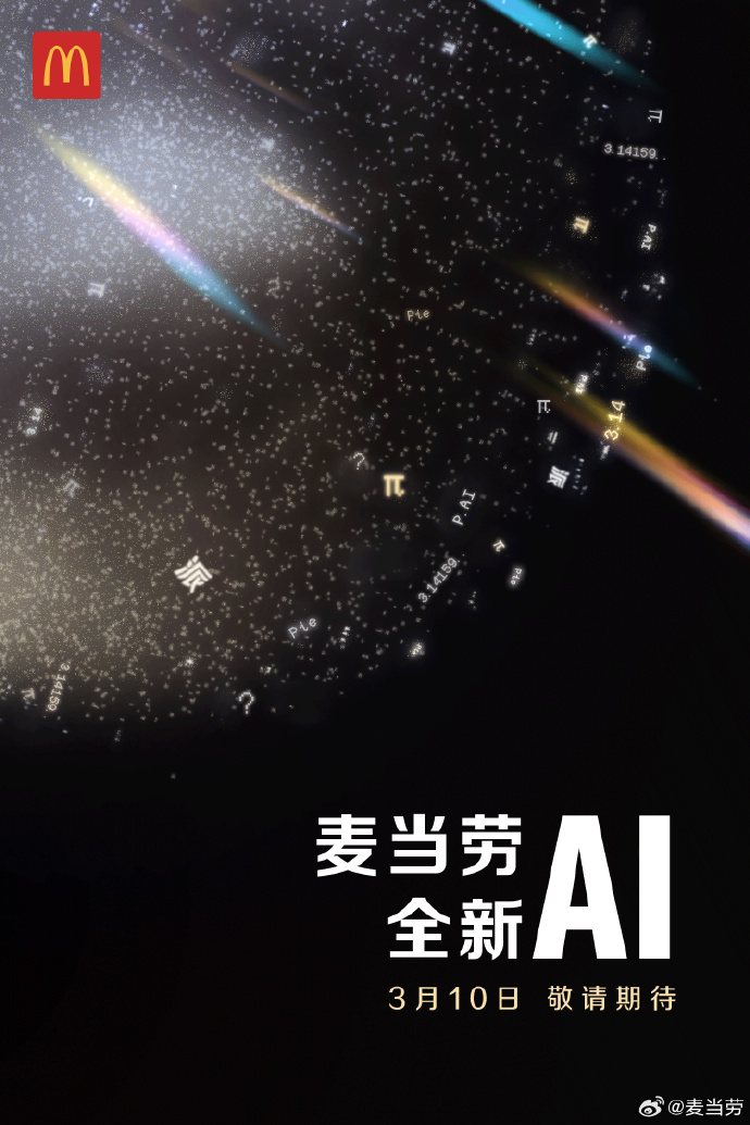 昨日中午,麦当劳发文宣布,将在 3 月 10 日推出「全新 AI」产品,并表示「敬请期待」。