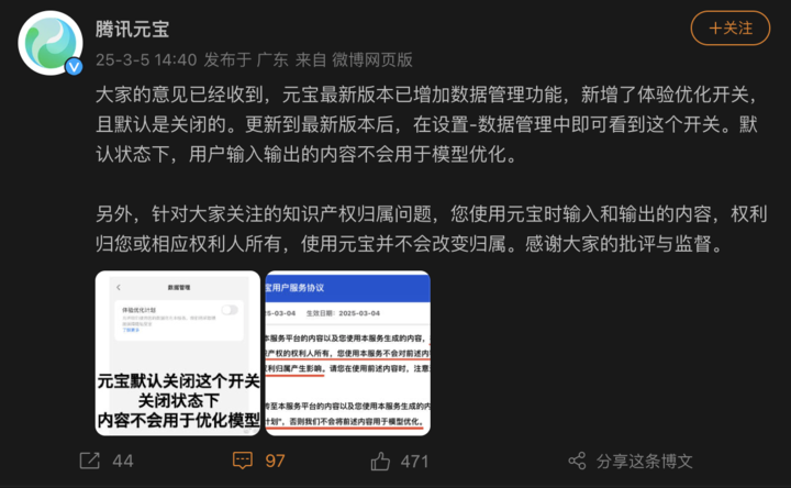 昨日,腾讯元宝发文道歉,并表示已收到用户的意见。其表示,元宝最新版本已增加数据管理功能,新增了体验优化开关,且默认是关闭的。更新到最新版本后,在「设置 — 数据管理」中即可看到这个开关。默认状态下,用户输入输出的内容不会用于模型优化。