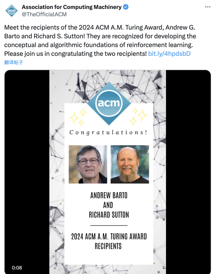 ACM 主席 Yannis Ioannidis 评价表示,Barto 和 Sutton 的贡献不仅仅是一个过渡阶段的成果,而是一个仍在持续发展的领域。强化学习仍在不断进步,不仅推动计算机科学的发展,也为许多其他学科带来了无限可能。因此,ACM 授予他们计算机领域最具影响力的奖项。