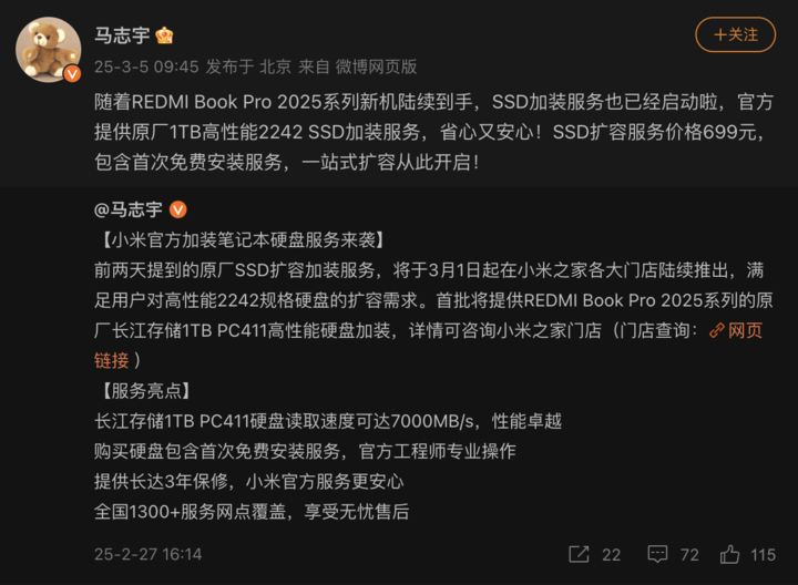 昨日,小米通讯技术有限公司产品行销总监马志宇发文表示,随着 REDMI Book Pro 2025 系列新机陆续到手,SSD 加装服务也已经启动。