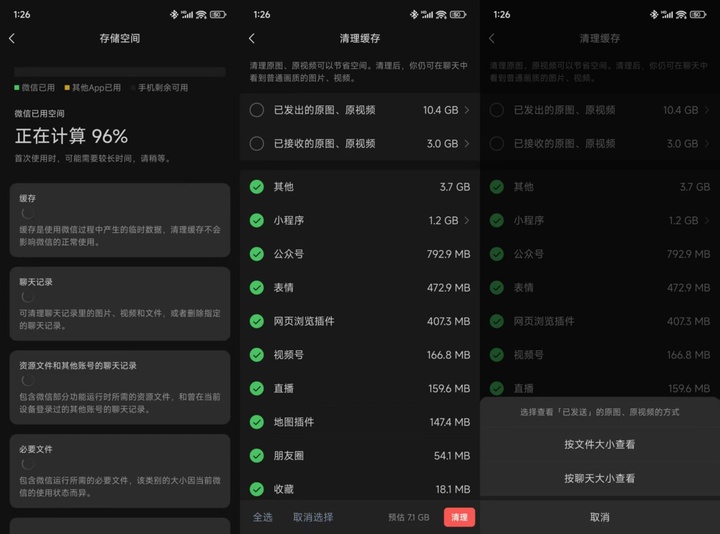 在原图、原视频点开之后右侧选项之后,会弹出「按文件大小查看」或「按聊天大小查看」,进而按照大小、时间、类型查看具体的原图、原视频,自行选择需要清理的内容。