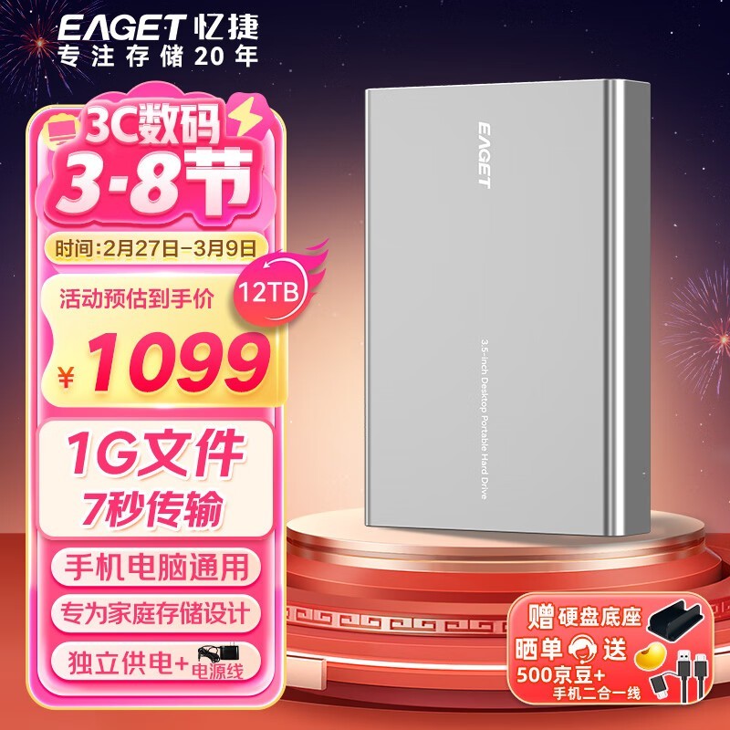 忆捷12TB移动硬盘京东优惠价低至1003元