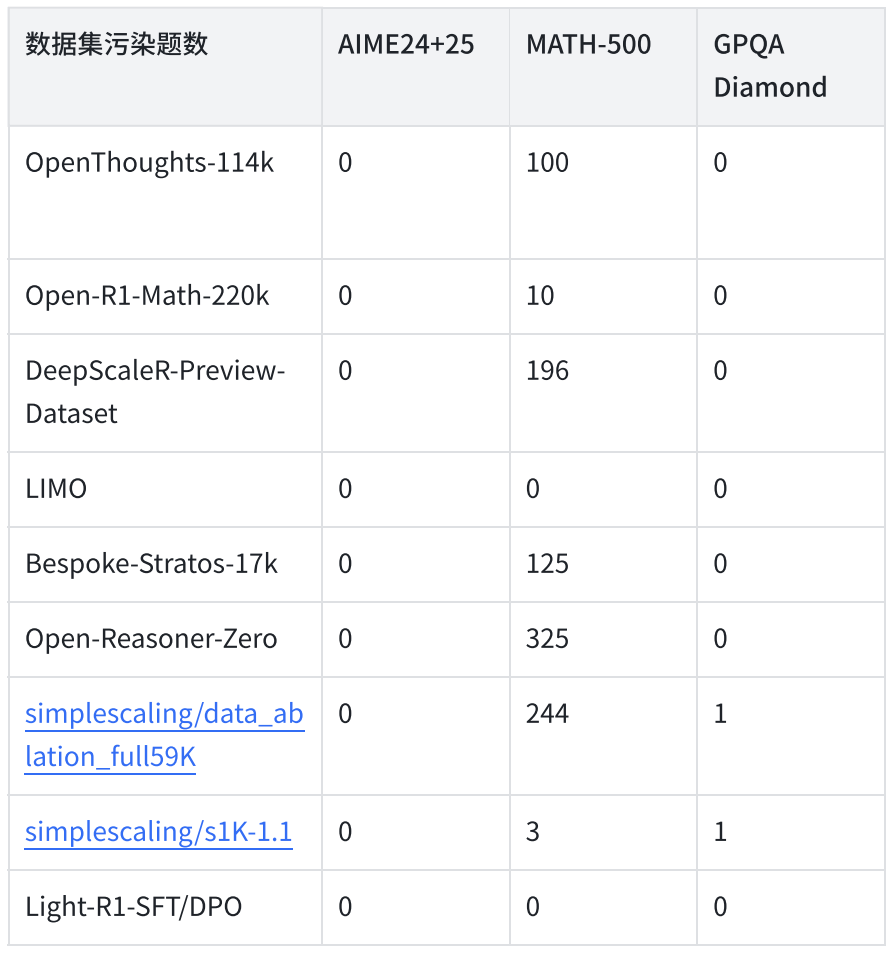 基准测试分数既有其重要性,也有局限性。虽然预训练阶段的个别基准测试污染难以完全避免,但在后训练阶段,应当严格杜绝数据污染,在训练集中对测试数据严格去重。360 智脑在研发过程中发现,虽然开源数据集对 AIME 都没有污染,但是在 MATH-500 和 GPQA 上都存在一定污染,通过 N-gram 或纯字母匹配检测,可以发现原题或仅更改数字的计算题。针对这种情况,Light-R1-32B 在训练过程中做了严格去重。