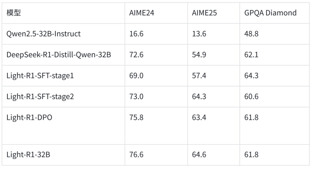 360 智脑开源的 Light-R1-32B 实现了突破,从没有长思维链的 Qwen2.5-32B-Instruct 开始训练,它在 AIME24 上取得了 76.6 的高分、在 AIME25 上 64.6 分,均显著超越 DeepSeek-R1-Distill-Qwen-32B。