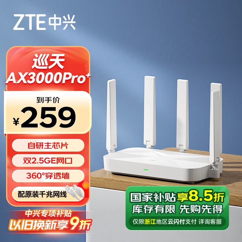 中兴巡天AX3000Pro+无线路由器京东特惠至185元