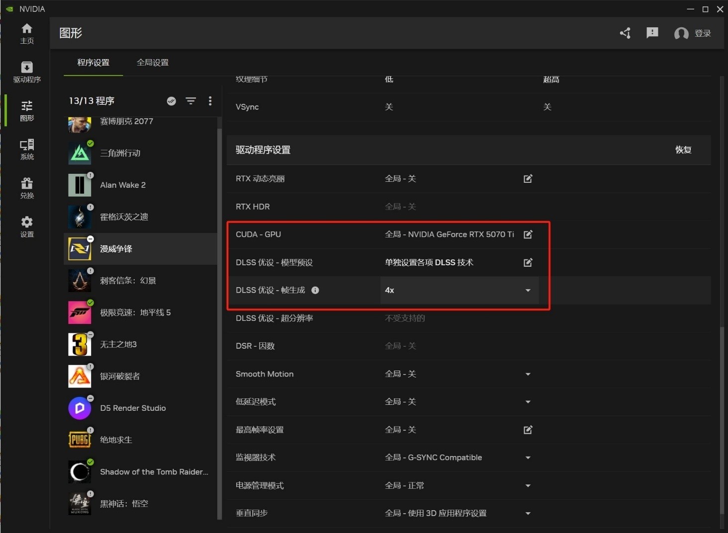 打开NVIDIA app后,切换至图形选项卡,找到对应的游戏,拉至最下方【驱动程序设置】,找到DLSS模型预设,将内部选项全部调节至最新后,开启DLSS帧生成4X,即可享受帧数的暴力加成。