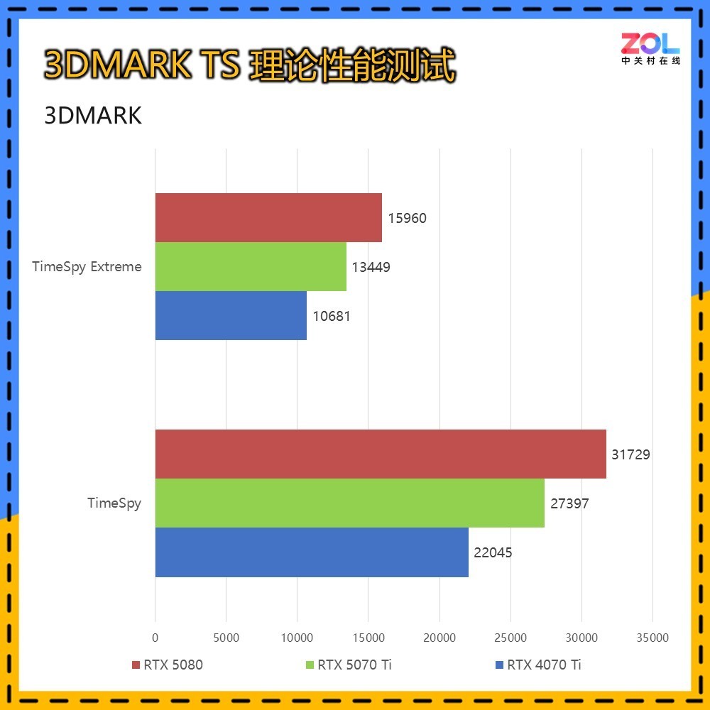 在针对显卡DX11性能的3DMARK FS套装测试中,RTX 5070 Ti 16GB的提升对比RTX 5080,和RTX 4070 Ti,在三档分辨率中相较RTX 4070 Ti提升分别为,23%/31%/34%,综合提升约为29%。而相比RTX 5080的差距为11%/13%/15%,综合约为13%。