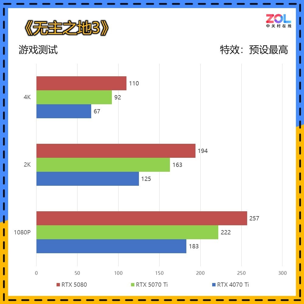 在《无主之地3》中,RTX 5070 Ti 16GB相比RTX 4070Ti的提升分别为:1080p提升21%;2K提升30%;4K提升37%,综合提升29%。在纯光栅化游戏帧数对比中,《无主之地3》比较能概括RTX 5070 Ti与RTX 4070 Ti的光栅化性能的综合差距。