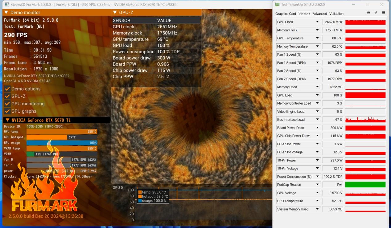 影驰RTX 5070 Ti 金属大师白金版在2小时左右的烤机测试中GPU温度为68.5℃;显存温度为62℃。另外可以看到在TDP 100%的满载情况下,整卡功耗为300W。