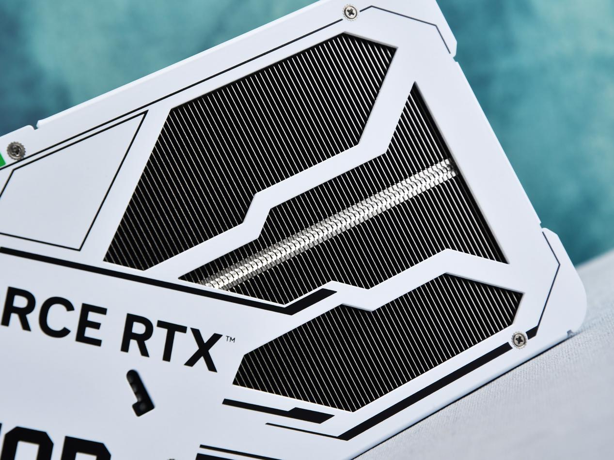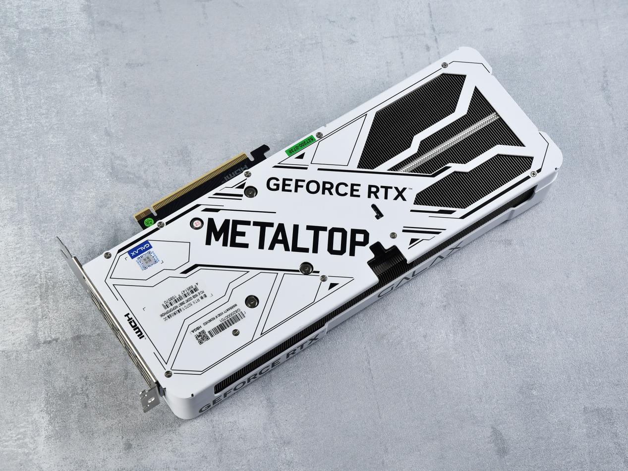 背板方面,影驰采用了全金属加固背板,不仅可以保护显卡背面元件,还可以防止显卡PCB变形。同时右侧开有大面积的散热风孔,与背板上的线条切割设计相辅相成。