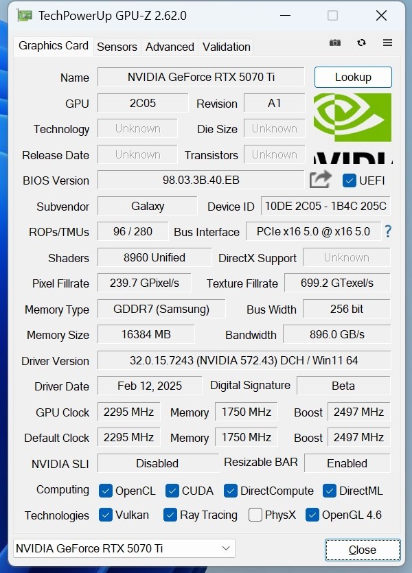 首先看一下GPU-Z的参数,截至目前发稿时,部分参数尚无法识别。影驰 RTX 5070 Ti 金属大师白金版采用GB203核心,与RTX 5080相同;采用与上一代相同的TSMC 4nm定制工艺(TSMC 4nm 4N NVIDIA CustomProcess),芯片面积378mm2。值得注意的是,在RTX 50系显卡中,使用了PCIEx165.0带宽。