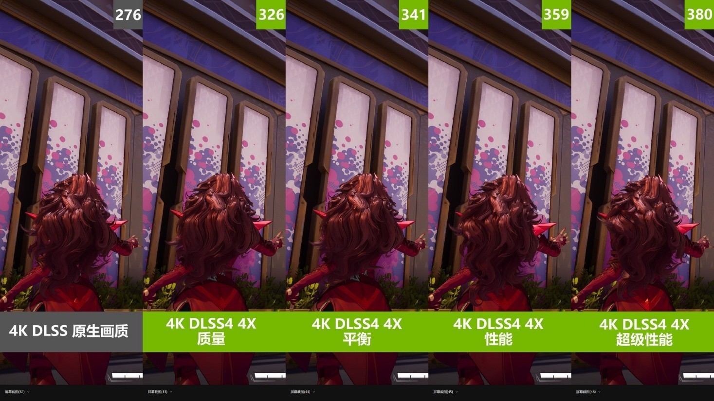 在画面对比中,DLSS 4 4X的四档画质也很难看出区别,角色的头发、衣服,远处的建筑涂绘,基本都和原生画质分毫不差。