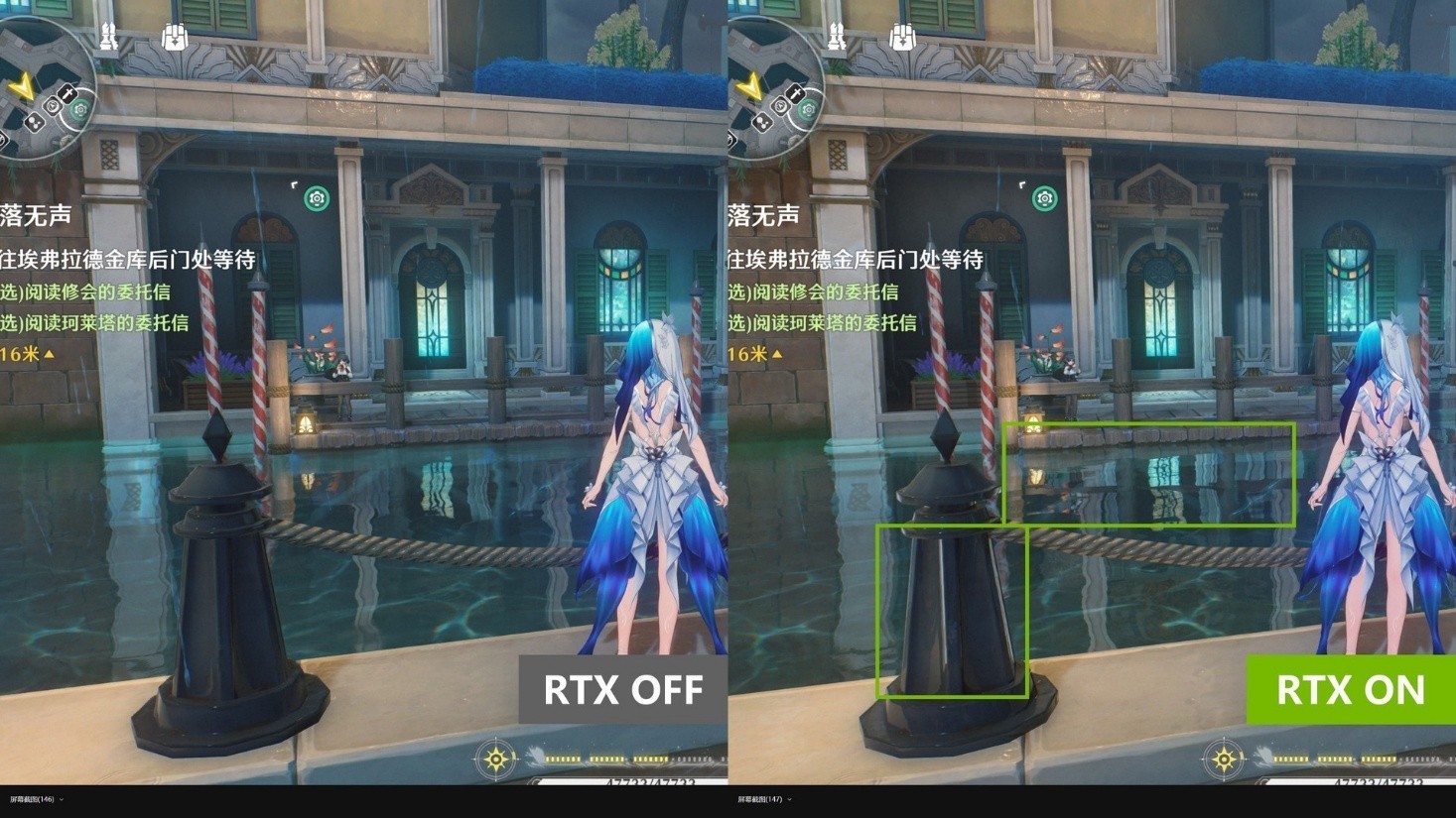 光追较为明显的区域永远离不开水面,从图中可以看到开启光追后,对面NPC在水中的倒影更清晰,且水面线与建筑的过渡更柔和。而近处物体也能够吸收地面二次反射的光线,让轮廓更清晰。