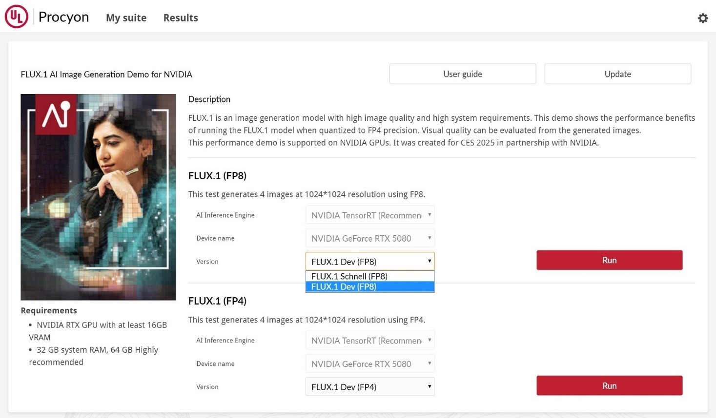 本次测试UL提供了FLUX.1Dev绘画模型的FP4测试,该模型在FP16上运行需要超过23GB的显存,而这意味着它只能由每一代的期间产品RTX 4090,RTX 5090和专业GPU来支持。但FP4只需要不到一半的显存。而且FP4使用NVIDIA Tensor RT提供的量化方法,几乎没有质量损失。更小的显存消耗让更多80级和70级的显卡均能在本地运行。