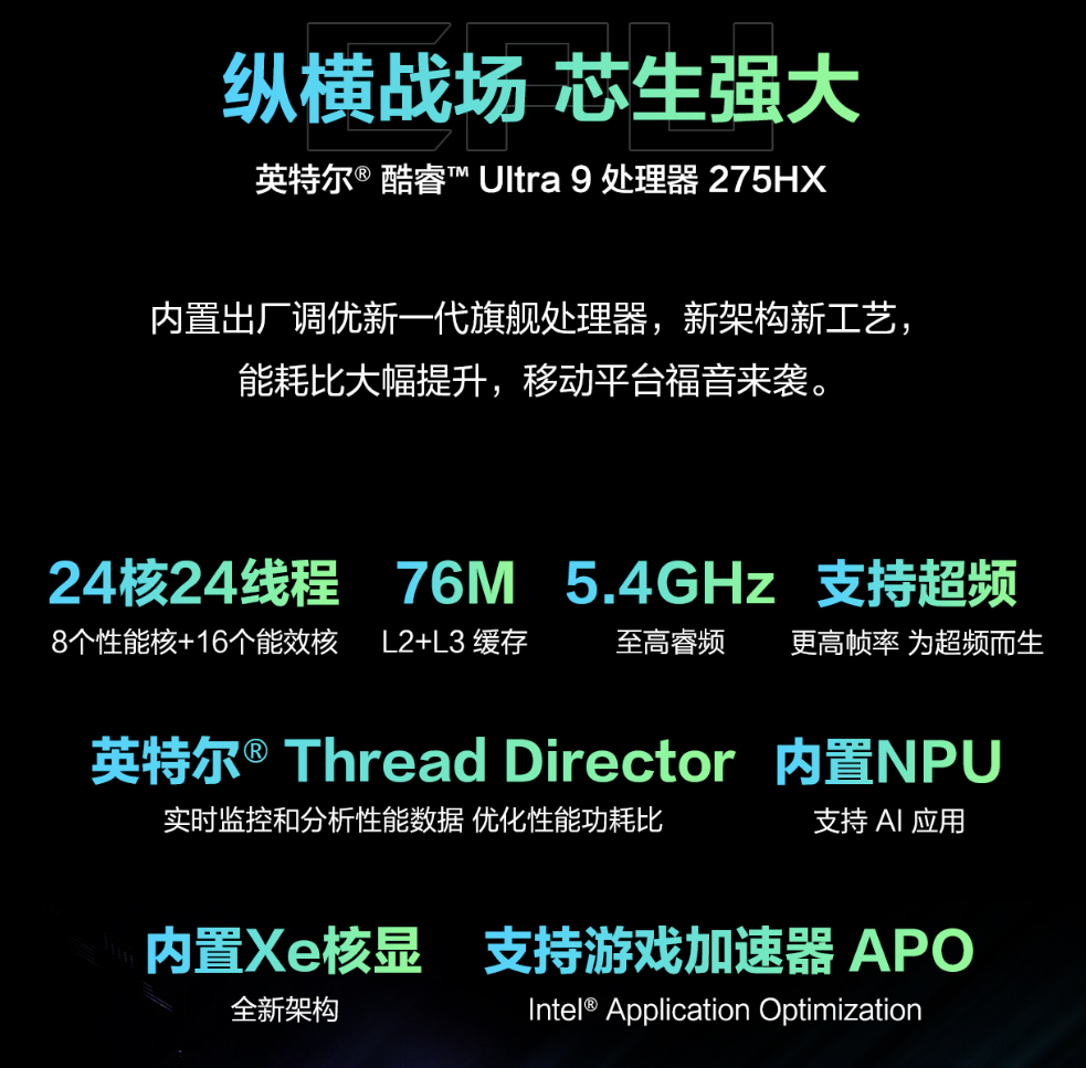 核心硬件方面,枪神9 Plus搭载了英特尔酷睿Ultra 9 275HX处理器,为整机性能带来了全面的升级。该款处理器拥有24核心24线程,并且L2+L3缓存高达76M,令多任务处理游刃有余。此外,该款处理器的睿频频率可达到5.4GHz,运行速度提升明显。同时,内核集成了CPU+iGPU+NPU处理单元,,轻松拿捏任何应用场景。