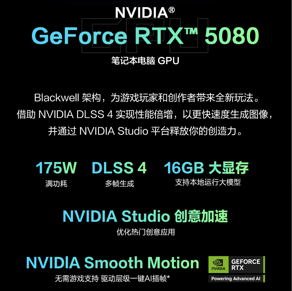 显卡方面,枪神9 Plus采用了175W满功耗、16GB大显存的RTX 5080,此款显卡支持光线追踪技术,并且进行了全面升级,全新的Blackwell架构相比于上一代RTX40系列能效比有了明显的提升,性能极强。此外,进一步升级的RTX 50系列笔记本电脑GPU支持DLSS 4技术,实现了性能倍增,让玩家的游戏帧数大幅提升。