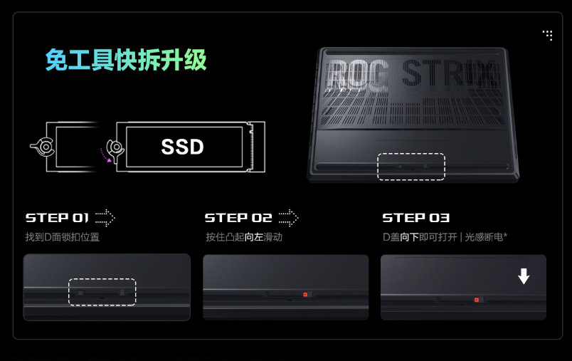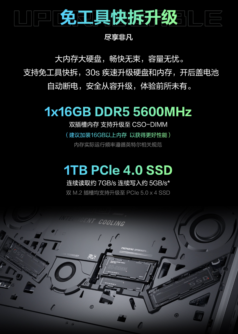 当然,最重要的是,枪神9 Plus首次使用了免工具快拆升级存储的功能,配合光感断电技术,30秒即可完成内存、硬盘更换,极为方便。