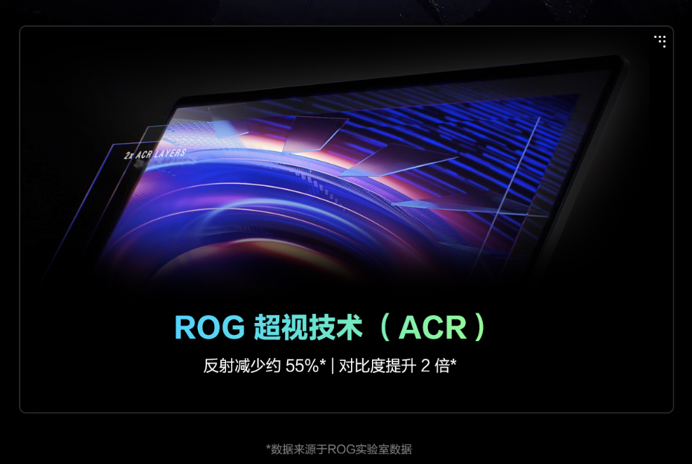 屏幕升级到了星云屏2.0,配以了ROG超视技术(ACR),能够有效的提升环境光对比度,同时减少反射约55%,让屏幕在大角度观看时,也能无反光无色偏,即使强光环境下,观感也是依旧鲜艳和通透,给予玩家最沉浸的视觉体验。