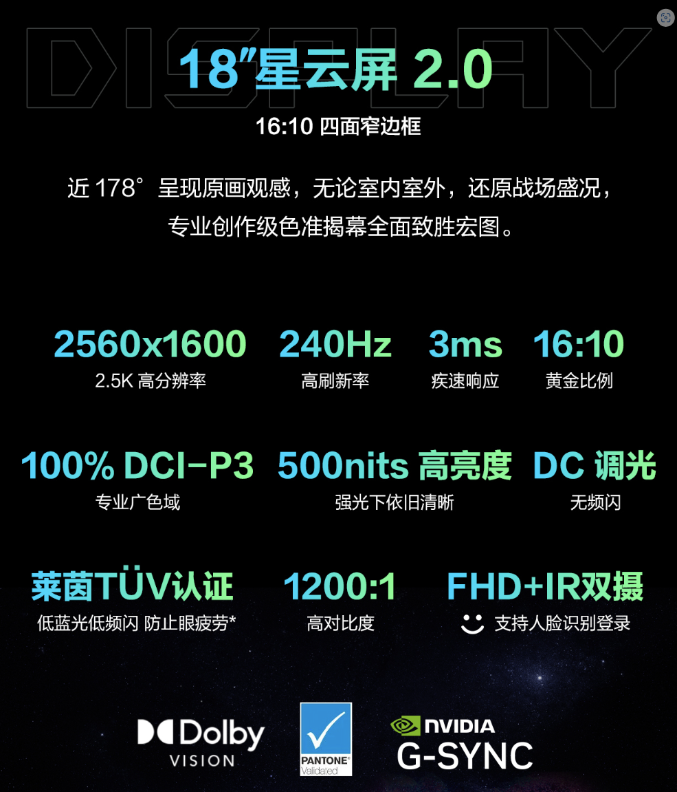 屏幕规格方面,18英寸的枪神9 Plus具有16:10的屏幕比例,2560*1600高分辨率,240Hz高刷新率,3ms的疾速相应时间,确保了游戏的观感。此外,还支持100% DCI-P3专业广色域和500nits的高亮度,为用户的创作工作也带来了极致的使用体验。
