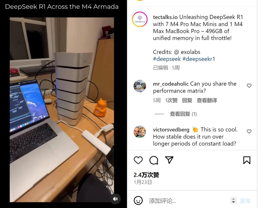由于同时有着售价低廉 + 高算力两个特征,去年的 Mac Studio 发布之后,就一直在开发者圈有着经久不衰的人气,火爆开发者圈:早在 DeepSeek R1 开源的初期,首先实现完全端侧本地部署的 671B「满血」版本 R1,就是由八台 Mac Studio 组成的算力集群驱动起来的。