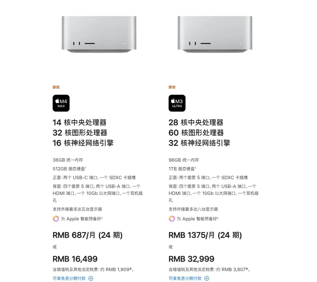 这一代 Mac Studio 延续了前代的 ID 外观设计,但分为了 M4 Max 和 M3 Ultra 两个版本,M4 Max 芯片的版本拥有 32GB 内存和 512GB 的硬盘空间,起售价 16499 元。搭载 M3 Ultra 芯片的版本拥有 96GB 内存和 1TB 的硬盘空间,起售价 32999 元。