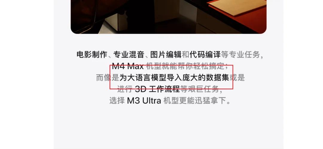M3 Ultra 的官网介绍中,直接用「登峰造极的性能」来形容它的定位,甚至微信推文中已经明确提到了可以用于模型训练的相关工作。
