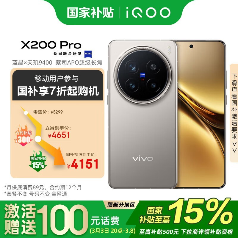 vivo X200 Pro手机钛色版12GB+256GB超级长焦功能优惠到手价4151元